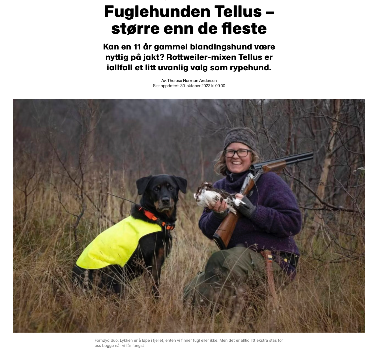 Hvordan starter man å beskrive sin bestevenn, jaktkamerat, turkamerat, treningskamerat, nærmeste familiemedlem og han som har vært med meg i tykt og tynt i nesten 15 år? Den kloke, fornuftige og sindige. Tellus var den hunden som begynte å jakte fugl i en alder av 11 år da jeg tok jegerprøven. Han begynte å apportere store ender langt utpå vann helt spontant i en alder av 12, han ble sledehund og elsket å løpe ved siden av spannet og skulle helst løpe helt foran de andre før jeg måtte tvinge han til å sitte i sleden for å hvile den litt trege, gamle skråtten. Han har besteget fjelltopper, han har sovet i telt, han har gått med meg i snøstorm, han har gått fra å være full av engstelse til å bli verdens tryggeste. Han kan jeg takke for at jeg har måttet gå gjennom omtrent ALLE adferdsproblemer innen både redsel for miljø, folk og andre bikkjer og gitt meg en enorm verktøykasse for hvordan man rehebiliterer, bygger opp en livredd og stressa hund til å bli en rygg, rolig og elskverdig hund som fungerer ypperlig i dagens samfunn.